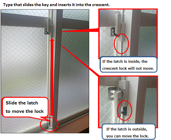 The crescent key type (for scrolling windows and doors) may have a security latch to prevent the lock from being open.