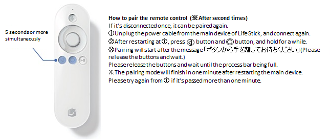 ※If it is the first time using the LifeStick, there may be an insulating tape on the back of the remote if it is a battery type. Please remove it.