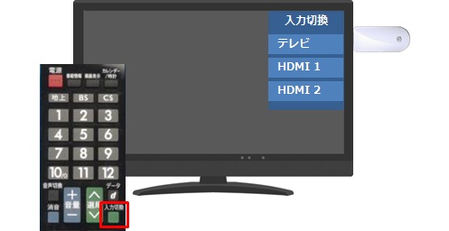 Look for the "change input" 【入力切替】 button on the TV remote then press it to change the input to 『HDMI』. (There might be 2 or more HDMI sockets, depending on the TV model. Check which socket the LifeStick is plugged to and change to that input.)