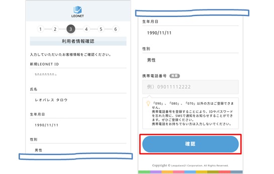 Register your customer information such as mobile phone number. Select 「確認」(Confirm).