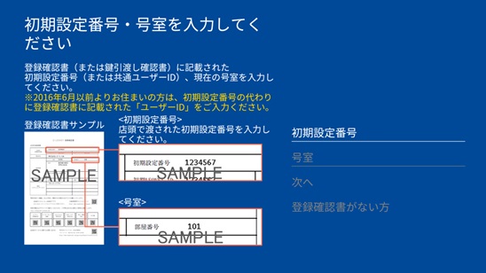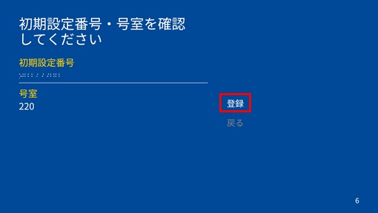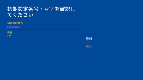 ⑦This is the confirmation screen for room contract information. Select 「登録」"Register" if the 「初期設定番号」(Initial configuration number) and room number are correct.