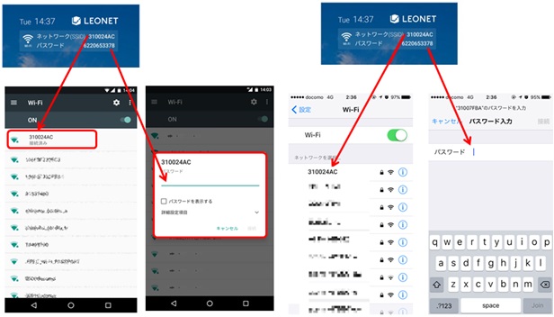 Find the SSID(wireless name) displayed on the LEONET top page on the WI-FI setting screen of your device, and enter the wireless password.