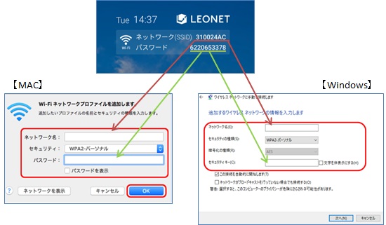 ③The connection key(Security key/ Network key) will be required, so please enter the password displayed on the right top corner of the LEONET service TOP screen.