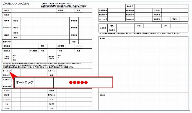 For the security code to open the Auto-Lock Gate, you can check the document "Instruction on the use of the room"「ご利用についてのご案内」 given along with the contract. (On contracts under the name of companies, we hand the document to the responsible on the company.)