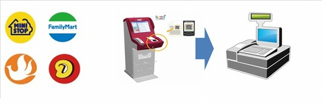 Scan a specialized bar code to a machine (Loppi) installed in a convenience store, register and present a newly issued receipt, and pay.