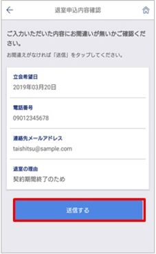 ・Enter the desired cancelation date, phone number and e-mail address contact then the reason for the moving out.