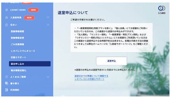 To apply for the moving out, access the "&Leo procedures / notifications"「&Leo 各種手続き・お知らせ」 smartTV app on the home screen of the device installed in your Television.