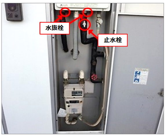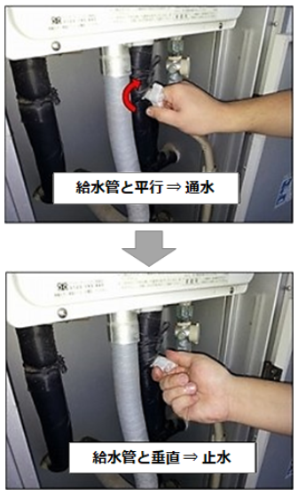・ If you forget to close the drain valve when performing step 5. above, water will spurt out from under the water heater when you open the water supply tap.